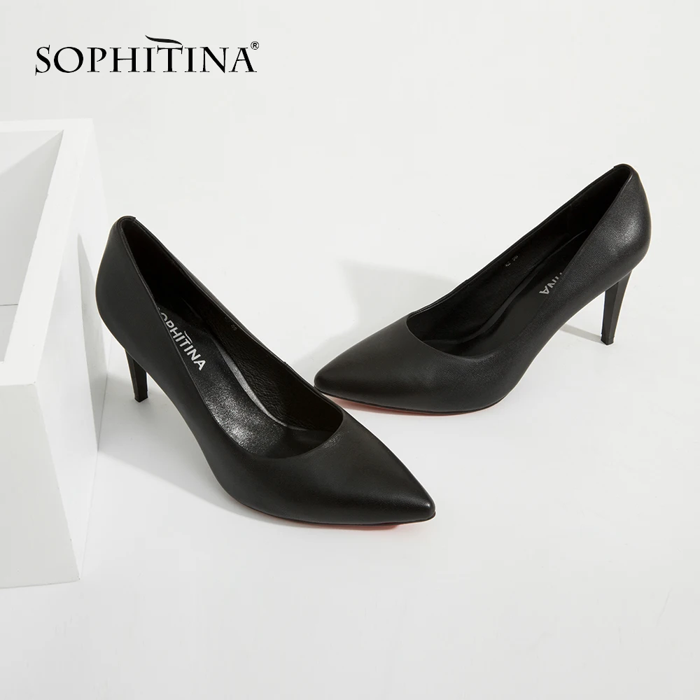 Sophitina Genuine Leather Thin Heel Pumps Solid High Heel Shallow Pointed Toe Fashion Ladies Shoes New Design Party Pumps Sc580
