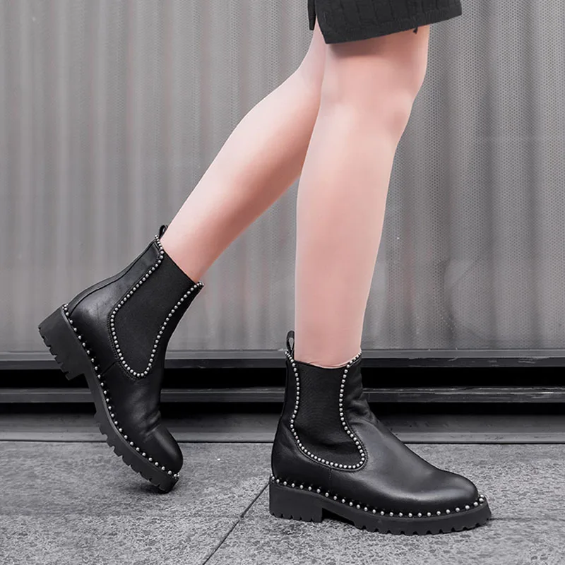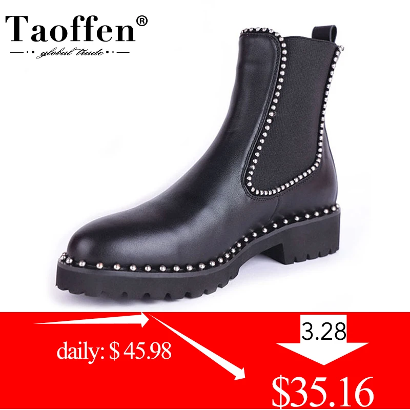 Limited Price Taoffen British Style Ankle Boots Women Genuine Leather Elastic Band Flats Shoes Rivets Round Toe W with Free Shipping Worldwide!